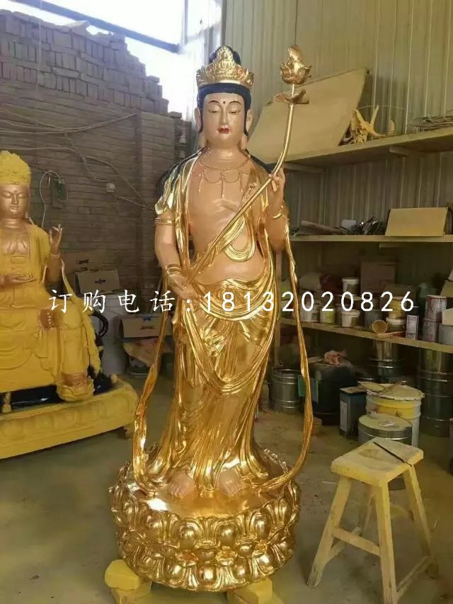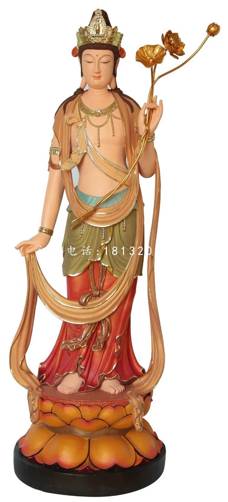 大勢至菩薩,又稱得大勢菩薩或大精進菩薩,簡稱為勢至。大勢至是梵文Mahās-thāmaprāpta的意譯。音譯為"摩訶那缽"。據《悲華經》卷二稱,刪提嵐世界的無諍念王有一千個兒子,長子名不眴,次子名尼摩。后無諍念王成佛為阿彌陀如來,不眴太子為觀世音菩薩。而尼摩太子則成了大勢至菩薩。菩薩跟隨佛學法修菩薩行,經過許多階段之后,才可成佛。菩薩中經歷所有的階段達到最高位的菩薩,就是一生補處菩薩。只要結束菩薩生涯,在下一階段的生涯中就定可成佛。若以三尊的形式表現佛陀時,必有一生補處菩薩隨侍左右,且組合是一定的。阿彌陀佛其左右脅侍的就是觀世音菩薩和大勢至菩薩,三位合稱"西方三圣"或"阿彌陀三尊"。