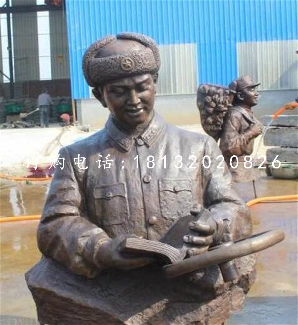 雷鋒出生于湖南省長沙市望城區一個貧苦農民家族的雷鋒有著不堪的經歷,年僅7歲的雷鋒淪為孤兒,于9歲結束了痛苦的生活,他得到黨和人民政府的關懷參加了兒童團,進小學讀書識了字,畢業后參加工作期間都被評為模范,他工作期間無論到哪個部門或工廠都盡心盡力的工作,雖然雷鋒一生只經歷了21個花開的季節,但是他的模范事跡和高尚思想卻在軍內外產生著巨大的影響,中華為民共和國國防部為其生前所在班為雷鋒班,而雕塑廠家就為其塑造了人物雕塑讓人緬懷紀念,讓其英雄事跡永垂不朽。同時,雷鋒的英雄事跡和無胃的付出得來的是人們永遠的懷念和學習,不僅為其塑了人物雕像,更應其故事編排成了歌謠、電影、電視劇、動畫片等。
