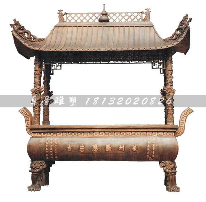 2、 大殿供桌上的香爐,有銅、石或瓷質(zhì)的,用以焚燒檀香,置于桌上的置香爐,如博山形、火舍形、金山寺形、蛸足形、鼎形、三足形、香印盤(pán)形等。