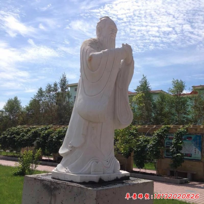 孔子雕像大多以站姿為造型,面部表情溫而厲,威而不猛,恭而安,長髯垂胸,衣袂飄飛,雙手合于胸前,目視遠(yuǎn)方,身體左側(cè)佩戴有一把寶劍。雕像身體以簡樸、概括的手法,將人體的結(jié)構(gòu)融入自然的山石形態(tài)當(dāng)中,似巨石,似高山,氣勢(shì)磅礴,古樸雄渾。孔子作為人們膜拜敬仰的楷模,所以孔子雕像大多莊嚴(yán)凝重,以寫實(shí)的手法盡可能準(zhǔn)確地來表現(xiàn)孔子在我國人民心中的神圣形象。除神態(tài)外,人物服飾的刻畫也尤為細(xì)膩,或內(nèi)或外層次井然有序。