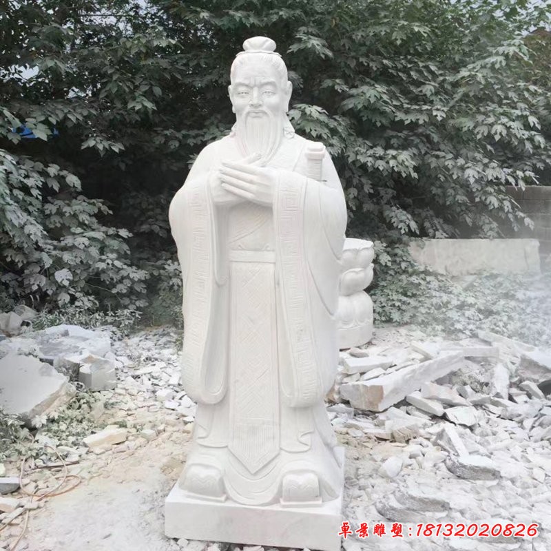 孔子雕塑大多以站姿為造型,面部表情溫而厲,威而不猛,恭而安,長髯垂胸,衣袂飄飛,雙手合于胸前,目視遠方,身體左側(cè)佩戴有一把寶劍。雕塑身體以簡樸、概括的手法,將人體的結(jié)構(gòu)融入自然的山石形態(tài)當(dāng)中,似巨石,似高山,氣勢磅礴,古樸雄渾。孔子作為人們膜拜敬仰的楷模,所以孔子雕塑大多莊嚴(yán)凝重,以寫實的手法盡可能準(zhǔn)確地來表現(xiàn)孔子在我國人民心中的神圣形象。除神態(tài)外,人物服飾的刻畫也尤為細膩,或內(nèi)或外層次井然有序。