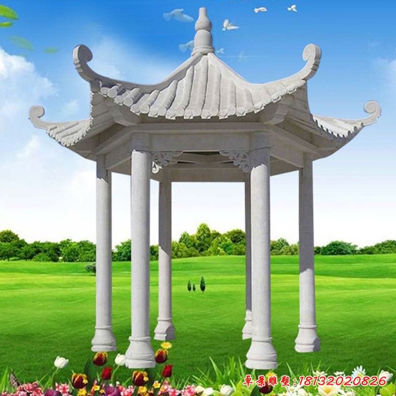 石雕涼亭的布置非常靈活。它不但可以點綴環境景觀,而且還具有一定的標示性作用,許多風景區和園林景觀中的重要景點.即是以涼亭作為主要標志的,在有些園林景觀中還甚至以主景亭子為園名。涼亭既為人們欣賞四時浪漫的景色提供了最佳觀賞點,又為環境增色。石雕亭子不但起到了標示性的作用,而且使環境園林景觀化,賦予景致更多的文化內容。點景之亭子作為區域空間內的趣味中心,有著點景和觀景的雙重作用。既從亭子內外望,要有景可觀;從外望亭子,又要能夠起到點綴和渲染環境景觀的作用。石雕涼亭在一些景區中,還可以作為一個連接的效果,將許多景點自然的聯系在一起,讓所有的景色看起來有著一定的韻律連接在一起。石雕涼亭根據位置和周圍的景色的不同,起到的作用是不同的,所以說石雕涼亭的位置的選擇是非常的重要的。