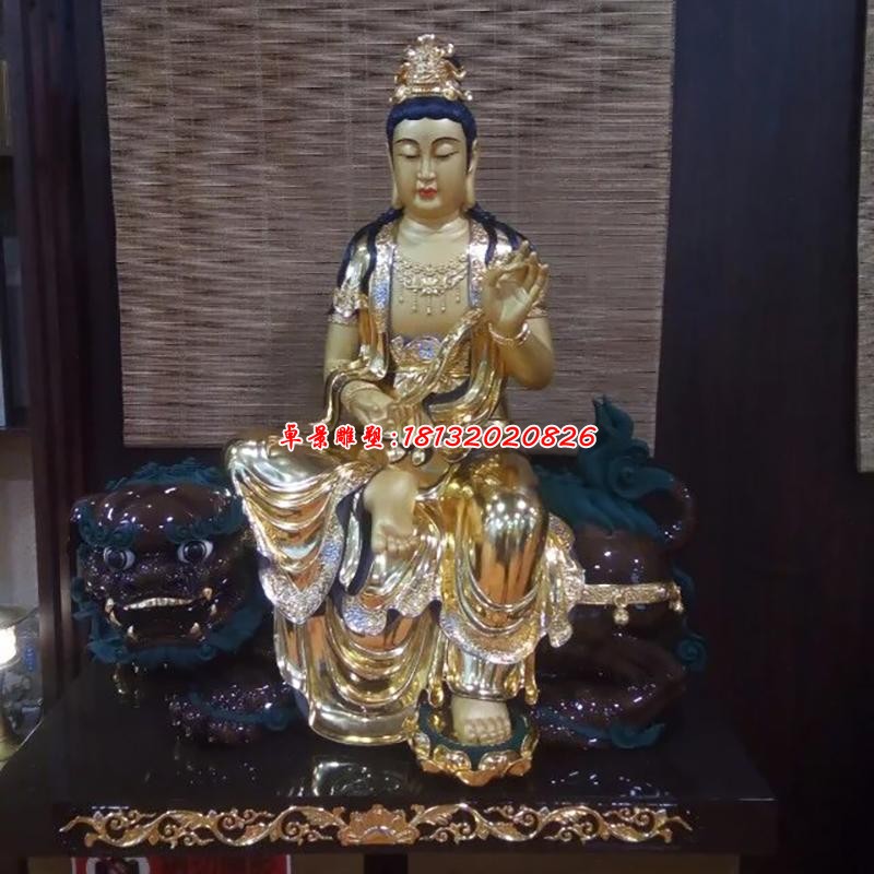 文殊是佛教四大菩薩之一,為釋迦佛的左侍者。在佛教中,普賢菩薩與文殊菩薩分別代表智與理。普賢菩薩是理之極者,而文殊菩薩則是智慧之極者大智文殊的道場在中國山西五臺山。塑像手執金劍,坐在獅子之上,象征文殊菩薩的威嚴,是智慧最高至極者,無堅不摧,無魔不降,這也是文殊菩薩法相的意思。文殊菩薩的塑像大多非男非女較似女性。唐朝以前的不少文殊菩薩與普賢一樣,唇上常畫有蝌蚪形的小胡子,頗似美丈夫。宋代以后小胡子消失,面容更加秀麗、腰肢窈窕,又趨于中國美婦人模樣。頭上有髻,每一髻俱作童子狀,有一髻文殊、五髻文殊、八髻文殊等。文殊的坐騎是頭青獅,表示智慧威猛手持寶劍表示智慧銳利。